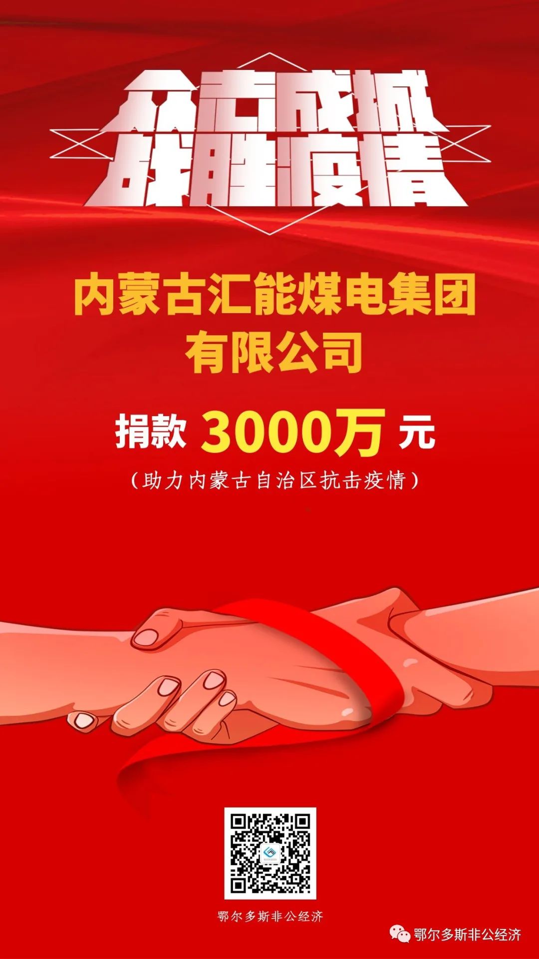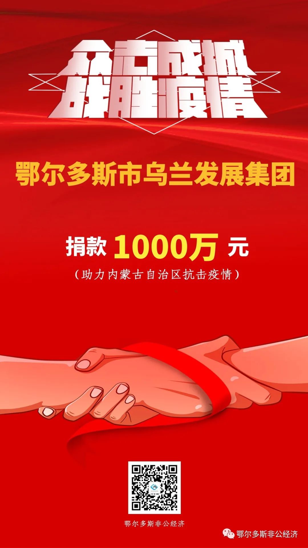 疫情發生后,我市多家民營企業聞令而動,通過捐資捐物全力配合支援呼和浩特市、包頭市打贏疫情防控阻擊戰,匯聚起眾志成城、萬眾一心的強大力量。其中,匯能集團捐款3000萬元、伊泰集團捐款2000萬元、滿世集團捐款1500萬元、烏蘭集團捐款1000萬元、蒙泰集團捐款1000萬元。民營企業以實際行動書寫熱愛祖國、奉獻社會、建設家鄉的家國情懷,彰顯了鄂爾多斯市本土民營企業的社會責任與擔當,為堅決打贏疫情防控阻擊戰貢獻了力量。